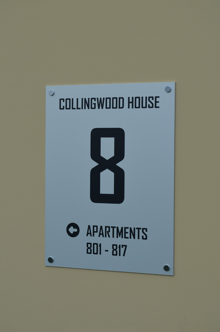 - Fire-tested signage for high-rise apartments.